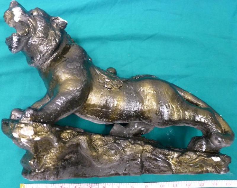 海關人員昨晚截查一名從馬來西亞吉隆坡市抵港男子,在其行李箱中搜出一尊重約三千克的老虎雕像,經檢查後發現雕像由蠟質及可卡因混合製成。