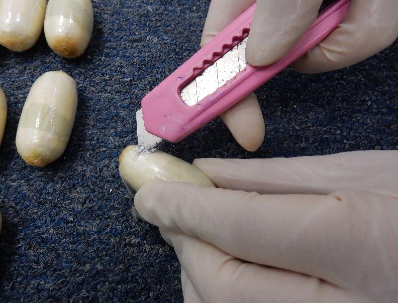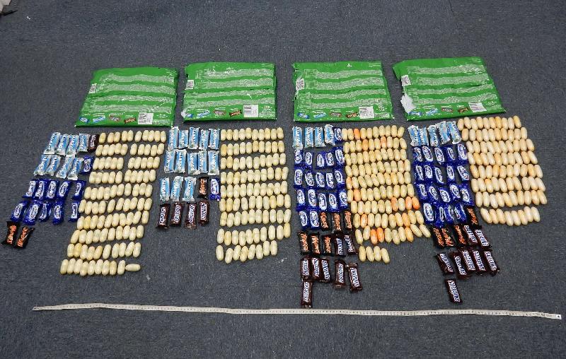 海關人員昨日在機場入境大堂截查一名從杜拜飛抵本港的男子,在替該名男子清關時,海關人員發現其手提背包內有四包糖果袋,經詳細檢查後,發現糖果袋內共藏有三百六十粒懷疑可卡因毒品,共重約六點三公斤。這批懷疑可卡因毒品是與真正的糖果混在一起。在其後的跟進調查,海關人員於同日再拘捕另外兩名涉案男子。