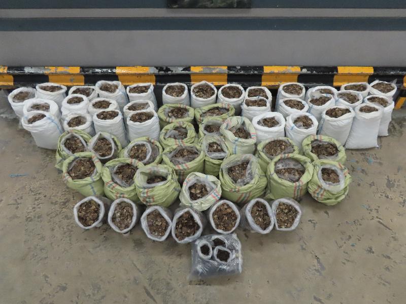 香港海關九月十六日在葵涌海關大樓驗貨場檢獲一批懷疑走私瀕危物種,包括約一噸穿山甲鱗片及約十三公斤乾蛇膽,估計市值約六百二十萬元。