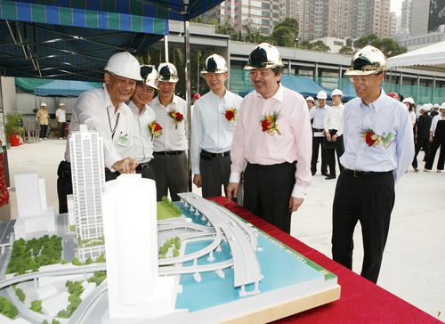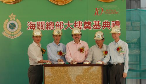財政司司長曾俊華、海關關長袁銘輝、建築署署長余熾鏗、瑞安集團主席羅康瑞和海關副關長黃秀培今日為海關總部大樓主持奠基儀式。