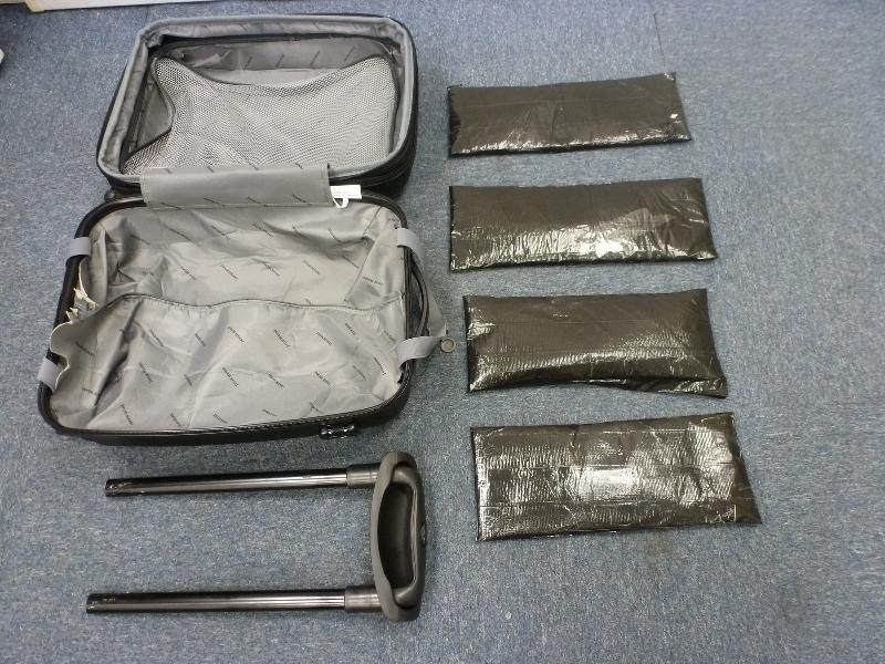 被捕男子從意大利米蘭經阿拉伯聯合酋長國杜拜飛抵本港。海關人員替該男子清關時,X光檢查顯示手提行李箱有可疑影像,經詳細檢查後,在該手提行李箱暗格內搜獲約三點二公斤懷疑可卡因毒品。