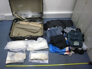 昨日上午約十一時十五分,海關人員截查該名從菲律賓馬尼拉抵港的三十三歲菲律賓籍女子,發現她所攜帶的一件行李底部有一暗格,內藏四包共重三點一四公斤的海洛英。