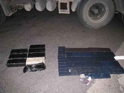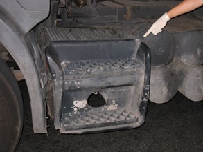 海關人員根據情報,截查一輛報稱載有塑膠粒的貨櫃車。在X光系統協助下,海關人員懷疑拖頭左邊前輪後方可能藏有物品。