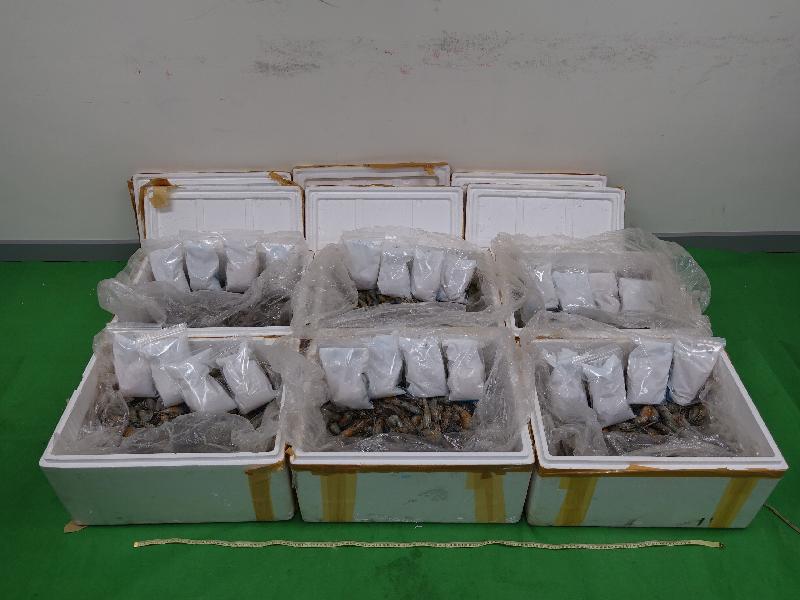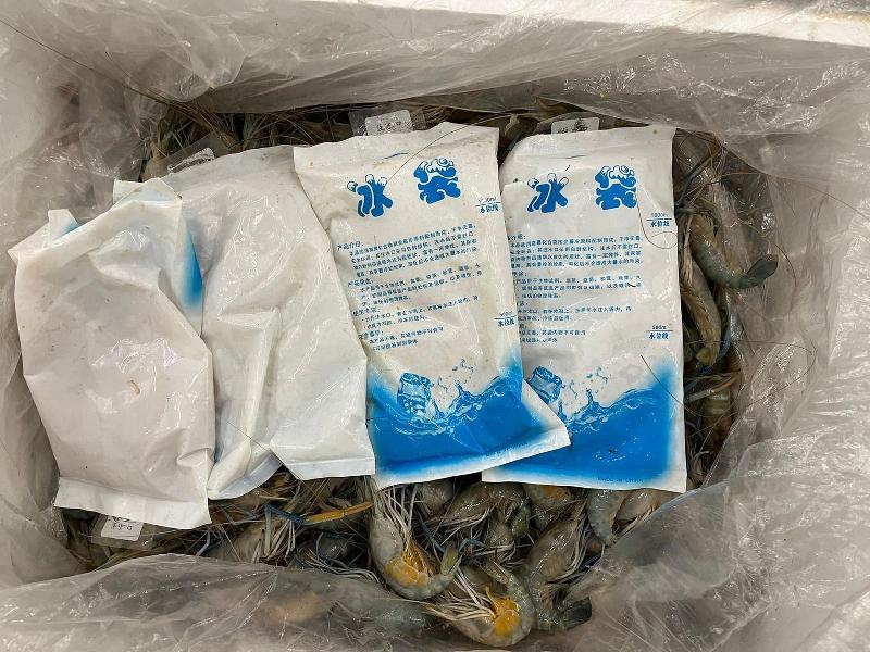 海關人員當日檢查一批從泰國抵港,報稱載有急凍蝦的空運貨物,在六個發泡膠箱內的冰袋中發現懷疑液態冰毒與一批蝦混雜收藏。