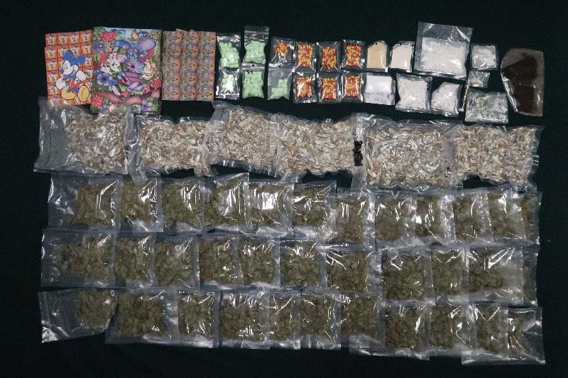 跟進調查後,海關人員昨日在葵涌一個住宅單位先後拘捕三名懷疑涉案男子,年齡介乎十九至二十三歲,並在單位內再檢獲約一點一公斤懷疑大麻花、約七百八十克懷疑「迷幻蘑菇」和約三百一十克其他懷疑毒品,包括阿普唑侖、「毒郵票」(即含有麥角二乙胺的郵票)和俗稱「浴鹽」的卡西酮等,以及一批毒品包裝工具。海關相信行動已成功搗破一個懷疑毒品分銷中心。