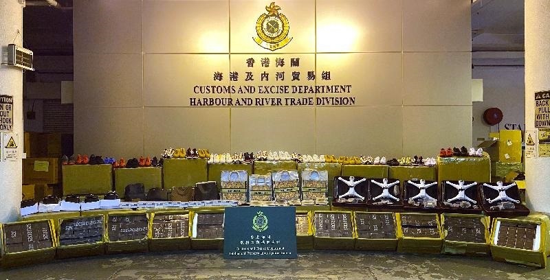 香港海關十二月十八日在屯門內河船碼頭檢獲約六萬三千件懷疑冒牌及走私貨物,估計市值約五百七十萬元。