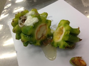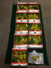 海關人員昨日在香港國際機場檢查一批報稱載有一百六十箱火龍果,來自哥倫比亞經英國到港的空運貨物。經檢查後,海關人員在其中五十一箱內發現有九十八個水果藏有懷疑液態可卡因,並混雜於其他水果當中。藏有毒品的水果被掏空,灌入懷疑液態可卡因,經膠水封口後,藏有毒品的水果外貌與一般水果無異。