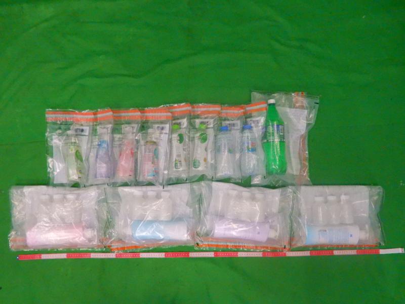 另外,一名男旅客昨日從泰國飛抵本港。海關人員替該名旅客進行清關,在他的行李內發現藏有十三個盛有共約七點九公斤懷疑液態氯胺酮的膠瓶,該名三十一歲男子因此被捕。案件仍在調查中。