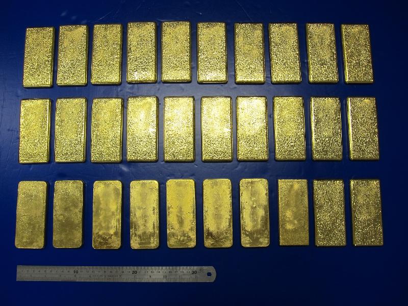 香港海關昨日(八月十七日)偵破一宗涉嫌走私案件,檢獲三十塊黃金,共重約三十公斤,約值一千一百萬元。