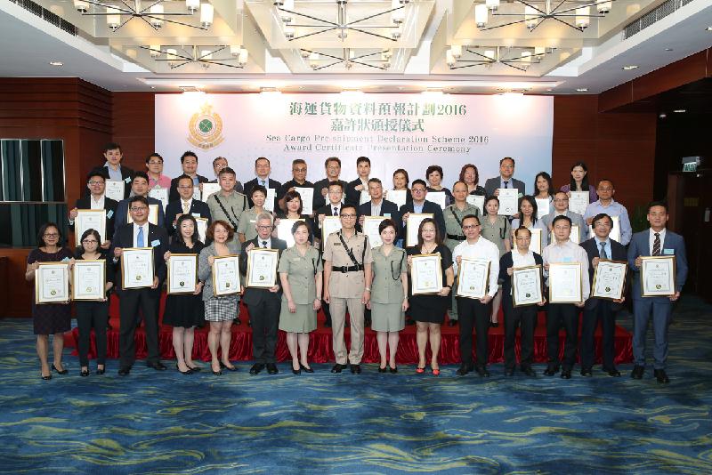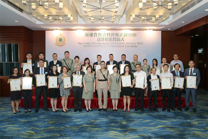 香港海關今日(八月十八日)在海關總部大樓舉行「海運貨物資料預報計劃2016」頒獎典禮,表揚四十間積極參與計劃並達到極高或甚高水平提交率而獲得金獎或銀獎嘉許狀的海運承運商/公司。