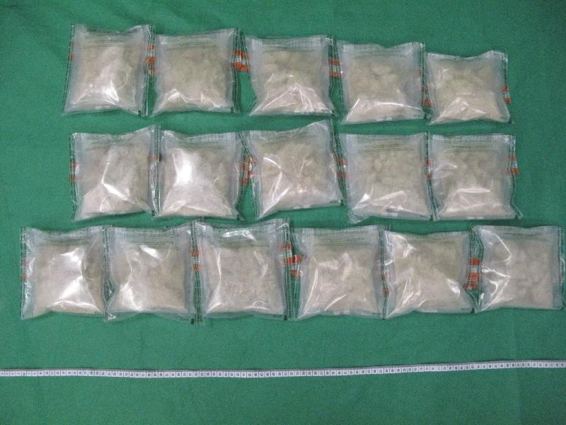 海關人員三月九日檢查一件從德國到港的空運郵包,在郵包內的十六個食物包裝盒中檢獲該批懷疑3,4-亞甲二氧基甲基安非他明。跟進調查後,海關人員昨日(三月二十一日)在土瓜灣拘捕一名三十歲懷疑涉案男子,並在其住所內檢獲少量懷疑冰毒及一批毒品吸食工具。