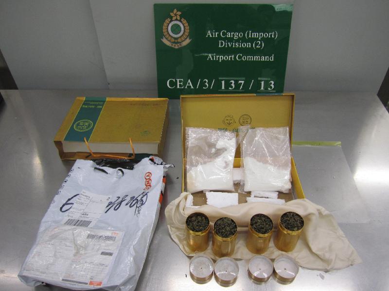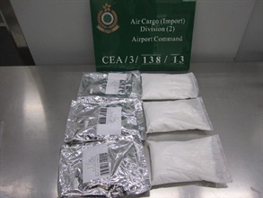 香港海關今日(五月三日)在亞洲空運中心破獲兩宗利用快遞郵件販運危險藥物的案件,合共檢獲約三點四公斤懷疑氯氨酮,市值約四十二萬元。