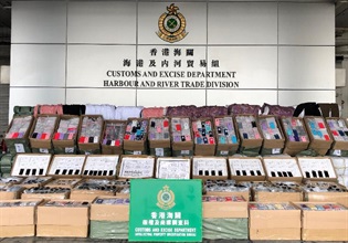 香港海關昨日(四月十一日)在屯門內河船碼頭海關驗貨場一個貨櫃內檢獲約一百五十箱懷疑冒牌手提電話配件和眼鏡及四百一十箱懷疑走私衣物,估計市值約三百八十萬元。