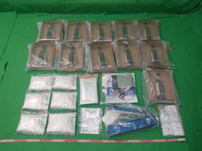 香港海關五月一日及昨日(五月七日)在香港國際機場及荃灣檢獲一批共約十一點八公斤懷疑毒品,以及一批毒品包裝工具,估計市值約一千零二十萬元。