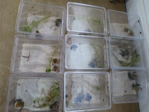 香港海關今日(十月十四日)在落馬洲管制站檢獲懷疑瀕危物種包括二十四隻蛙類、四十六隻龜和五十二條變色龍,市值共約二十萬元,並拘捕兩名男子。