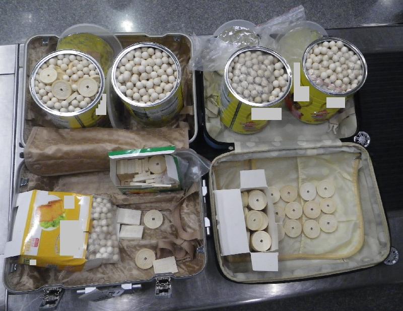 香港海關今日(十月十六日)在香港國際機場檢獲約二十九公斤懷疑象牙製品,市值約二十九萬元,並拘捕兩名抵港男子。
