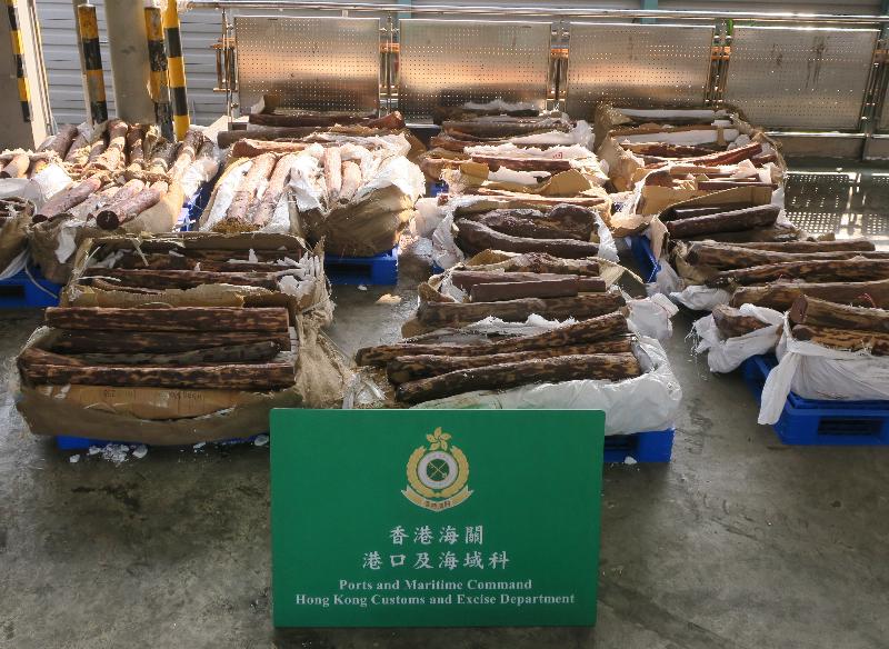 香港海關今日(五月五日)在葵涌海關大樓驗貨場的一個貨櫃內檢獲約一千四百一十五公斤懷疑檀香紫檀木材,估計市值約一百萬元。