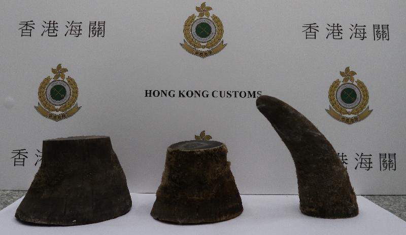香港海關今日(六月九日)在香港國際機場檢獲約二點五公斤懷疑犀牛角,估計市值約五十萬元。