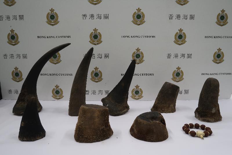香港海關今日(七月十一日)在香港國際機場檢獲約八點一六公斤懷疑犀牛角及約六十克懷疑象牙製品,估計市值共約一百六十三萬元。