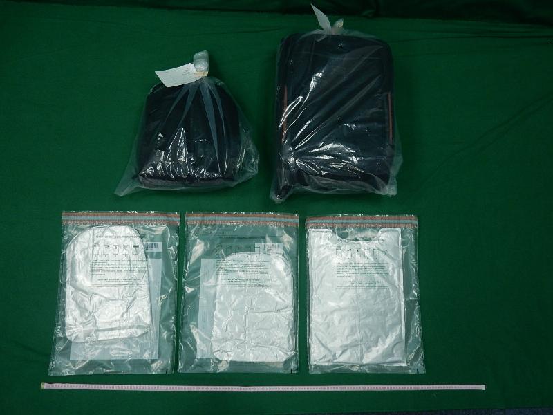 一名男旅客昨日下午從巴西里約熱內盧經阿拉伯聯合酋長國杜拜飛抵本港。海關人員檢查該名旅客的兩件手提行李時,發現三塊共重約三公斤懷疑可卡因收藏在兩件行李的底部。