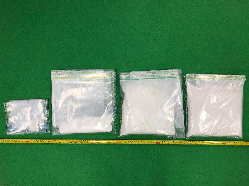跟進調查後,海關人員押解被捕男子至附近一個住宅單位內搜查,再檢獲約一點四公斤懷疑可卡因、約十克懷疑霹靂可卡因、約二百克懷疑非那西丁及一批包裝工具。
