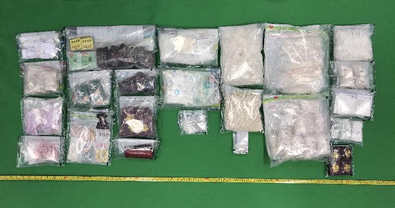 跟進調查後,海關人員押解被捕男子至附近一個酒店單位,再檢獲約二點六公斤懷疑霹靂可卡因、約九百克懷疑氯胺酮、約四百六十粒懷疑搖頭丸、約二百四十粒懷疑硝甲西泮、約十克懷疑大麻以及一批包裝工具。