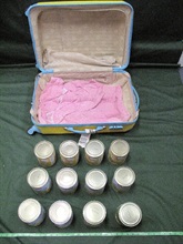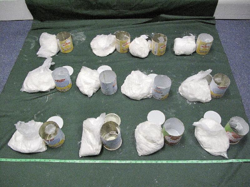 該兩名被捕人士從巴西聖保羅經阿拉伯聯合酋長國阿布扎比飛抵本港,二人為一名報稱無業的二十一歲男子及一名報稱收銀員的二十歲女子。海關人員檢查該名女子的寄艙行李時,發現其寄艙行李內有十二罐罐頭水果。經詳細檢查後,在罐頭內發現藏有該批毒品。