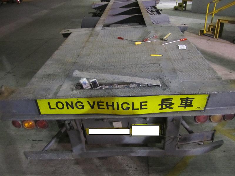 同日稍後,海關人員截查另一輛出境的貨櫃拖頭連40呎拖架及20呎貨櫃。貨櫃經移走後,發現拖架的中及後橫擔內暗格藏有696部走私電話。