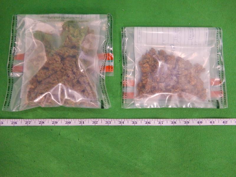 海關人員九月六日於香港國際機場檢查一件從加拿大到港的空運郵包時,發現約六十五克懷疑大麻花。跟進調查後,海關人員昨日在將軍澳拘捕一名三十五歲懷疑涉案男子,並在其住所內檢獲約三十五克懷疑大麻花及一批懷疑毒品吸食工具。