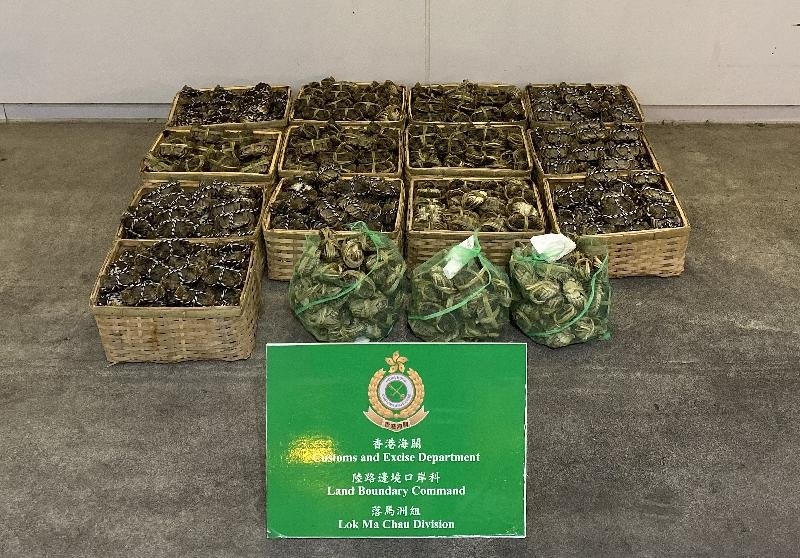 香港海關(海關)與食物環境衞生署(食環署)昨日(十月六日)在落馬洲管制站進行聯合行動,檢獲1 053隻懷疑走私大閘蟹,估計市值約二萬一千元。該案件為二O一八年以來檢獲懷疑走私大閘蟹數量最多的單一案件。