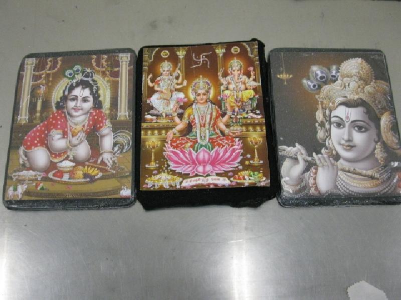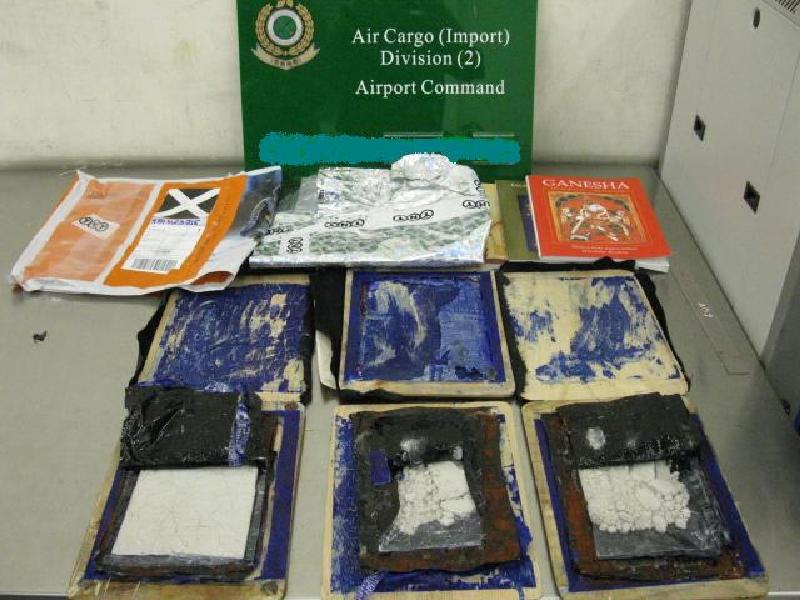 昨日下午,海關機場科人員在機場空運中心利用X光機檢驗一箱報稱為書本及相架的轉口空運貨物,發現三個木製相架懷疑暗藏異物,仔細檢驗後發現三百九十克海洛英藏於暗格之內,市值約二十萬元。跟進調查顯示上述貨物來自印度準備轉運至中國。