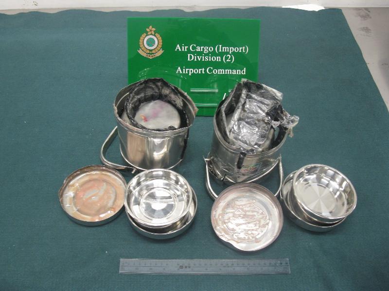約同一時間,海關人員在機場速遞中心一箱轉口貨物中,在報稱為茶壺的金屬壺真空隔熱層,搜出四百零八克鴉片,市值約十一萬元。資料顯示貨物來自老撾轉運至美國。