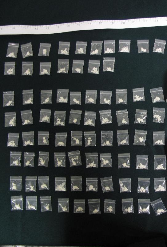 在毒品方面,海關共偵破五十九宗案件,檢獲四十八公斤懷疑毒品,估計市值約五百多萬元,並拘捕九名懷疑販運毒品的人士。大部分檢獲的毒品為合成毒品,例如俗稱「浴鹽」的卡西酮、俗稱「冰」毒的甲基安非他明及搖頭丸等,主要透過空運郵遞及快遞渠道偷運入境。