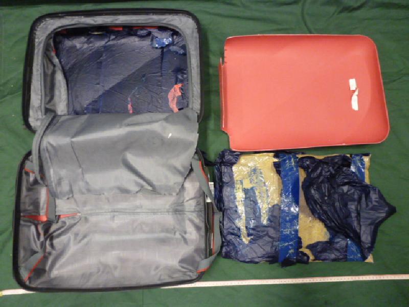 該名男子昨日從西非貝寧經肯尼亞內羅比飛抵本港。海關人員檢查該名男子的行李時,發現行李箱異常沉重。經X光檢驗後,發現行李箱內有暗格,於暗格內檢獲共重約兩公斤懷疑可卡因。