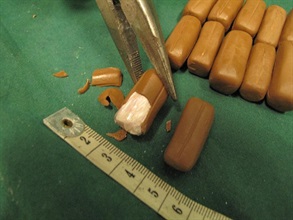 海關人員於昨日下午截查一名從巴西聖保羅,經阿拉伯聯合酋長國迪拜抵港的四十一歲女子,該名女子的兩個手提行李內藏多包糖果及舊物品,經X光檢驗後,海關人員發現糖果內有可疑影像,而行李內的兩個尼龍袋、禮物盒、鍵盤則藏有暗格,經詳細檢查後共檢獲共重約1.34公斤的懷疑可卡因。