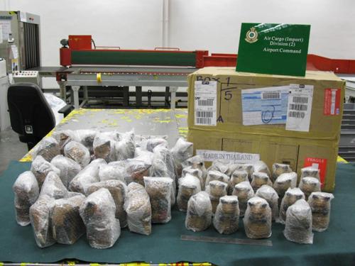 香港海關日前在香港國際機場速遞中心首次偵破兩宗利用速遞空郵偷運毒品熟鴉片由泰國到美國的案件,檢獲約45公斤熟鴉片,市值約1,170萬元。