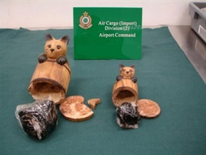 案情透露,海關機場科人員於九月二十七日清晨檢驗五件由清邁經香港轉運到加州,報稱「木製工藝品」的紙箱包裹。關員利用X光檢查後,發現箱內物品可疑,並開箱割開多件「木製貓」雕刻品檢驗,發現內裏藏有用膠袋包裝的熟鴉片,共重約29公斤。