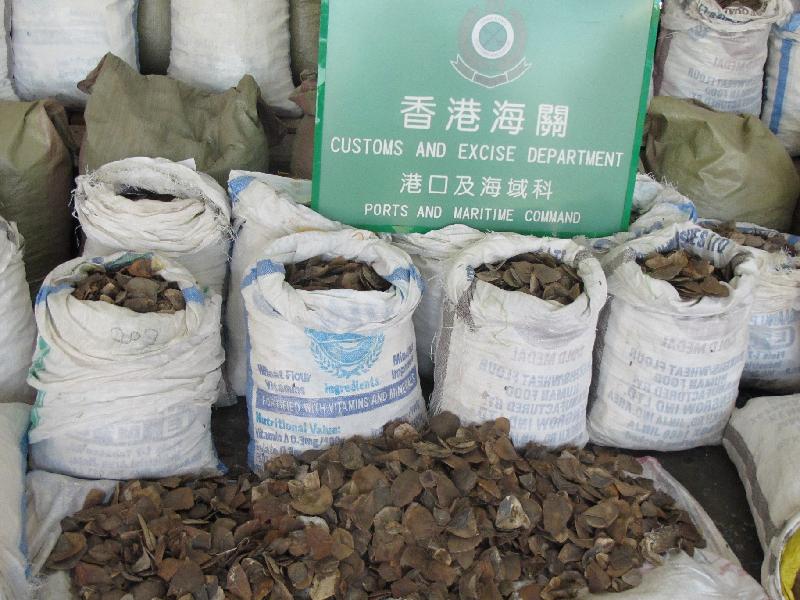 香港海關今日(五月二十八日)破獲一宗懷疑海路走私案件,在葵涌海關大樓驗貨場一個貨櫃內檢獲約一千公斤穿山甲鱗片,總值約五百萬元。這是五年來破獲的最大宗走私穿山甲鱗片案件。