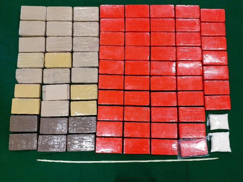 香港海關昨日(六月三十日)在屯門檢獲約七十九公斤懷疑可卡因及一公斤懷疑冰毒,估計市值約八千萬元,所檢獲懷疑可卡因數量為香港海關近五年來之最。