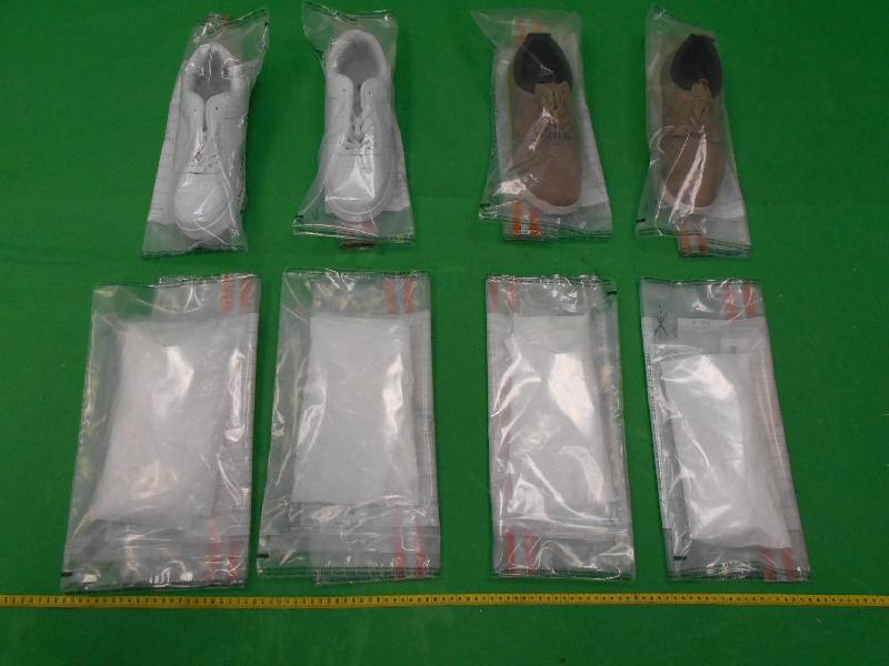 一名男旅客及一名女旅客昨日下午從馬來西亞吉隆坡飛抵本港。海關人員替該兩名旅客進行清關,在他們所穿著鞋履的暗格內發現共藏有四包懷疑海洛英,該兩名旅客因此被捕。