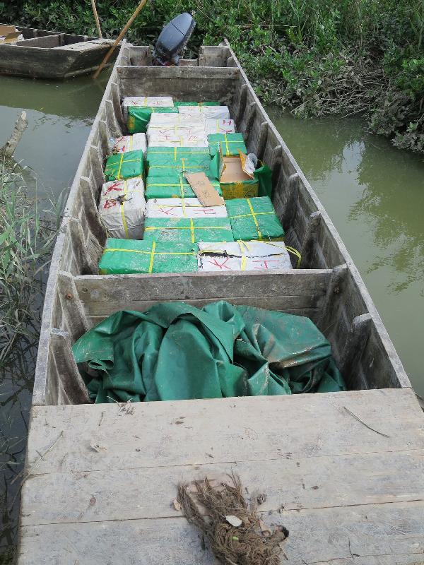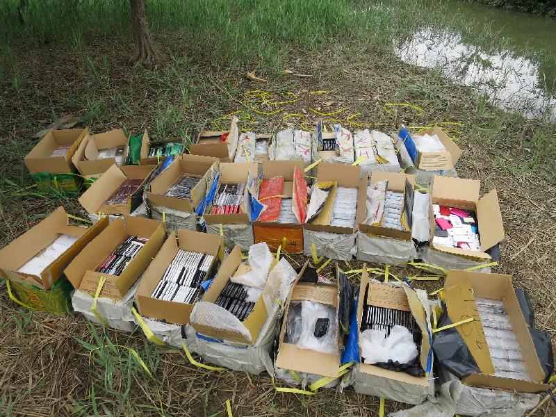 昨日清晨,海關稅收及一般調查科人員在元朗大生圍一條小河發現兩艘舢舨,各載有二十三箱未列於艙單的貨物。海關人員檢獲的四十六箱貨物,共有約五千部舊智能手機、二百部舊平板電腦及一萬件電子零件,總值約四百萬元。