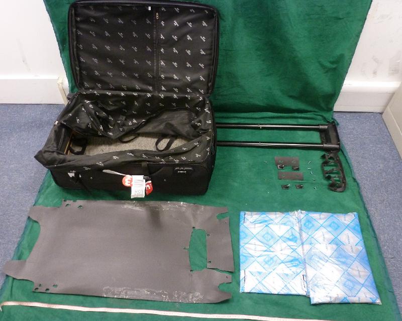 該名男子昨日從南非約翰內斯堡經新加坡飛抵本港。海關人員在檢查該名男子的寄倉行李時,將其行李箱的物件清空,發現行李箱仍然異常沉重。經詳細檢查後,在行李箱的夾層中檢獲該批懷疑可卡因毒品,相信販毒分子意圖藉此逃避海關人員的偵查。海關人員其後展開跟進調查,於同日在旺角再拘捕另一名涉案的男子。