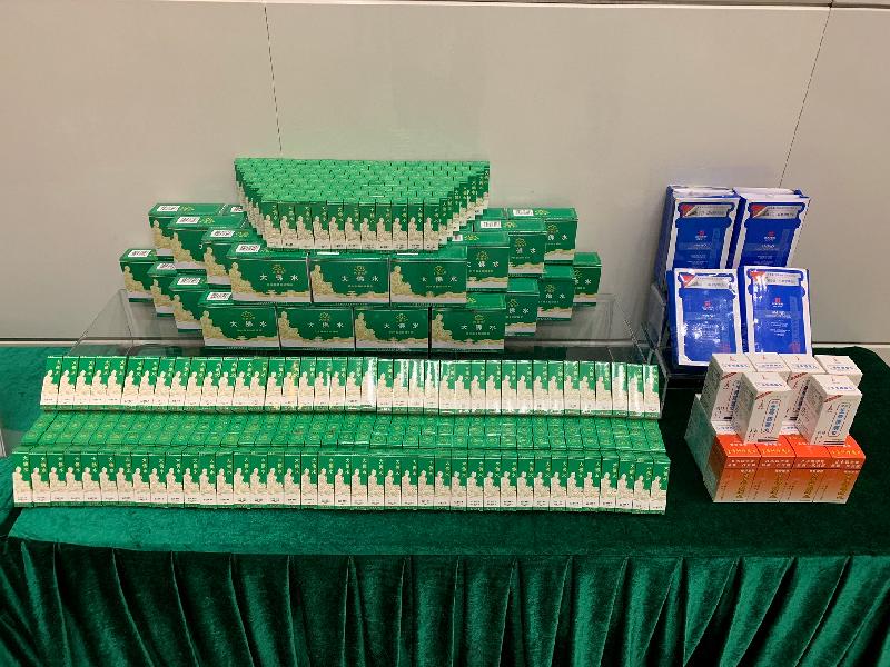 海關早前接獲舉報,指市面上有店鋪售賣懷疑冒牌中成藥。在商標持有人的協助下及經深入調查後,海關人員十月三十日至今日在全港不同地區採取一連三日的執法行動,共掃蕩十三間分別位於上環、旺角、葵興、沙田、屯門、元朗及上水的零售店鋪,檢獲共約七百件懷疑冒牌中成藥及其他懷疑冒牌物品。