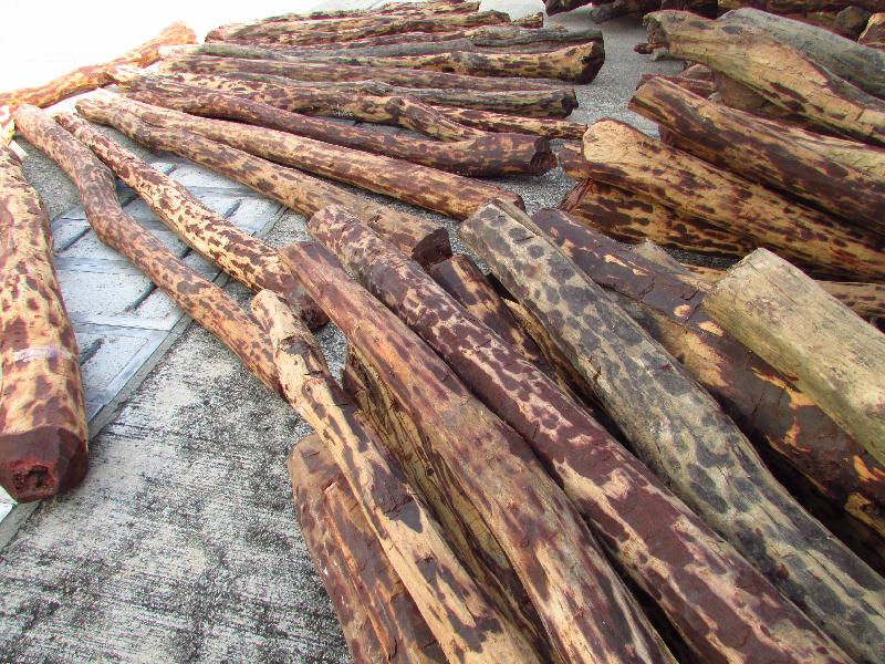 香港海關昨日(十二月十五日)在屯門破獲一宗內河船涉嫌走私案件,共檢獲約三千三百六十公斤懷疑屬於瀕危物種的紫檀木,總值約一百三十萬元。