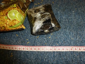 該名男子從印度加爾各答經雲南昆明飛抵本港。海關人員檢查行李,在十四包即食麵包裝袋內檢獲該批懷疑大麻樹脂。