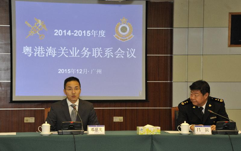香港海關與廣東海關今日(十二月一日)在廣東廣州舉行「二○一四至一五年粵港海關業務聯繫會議」。香港海關代表團由香港海關關長鄧忍光率領,廣東海關代表團則由國家海關總署副署長兼廣東分署主任呂濱率領。