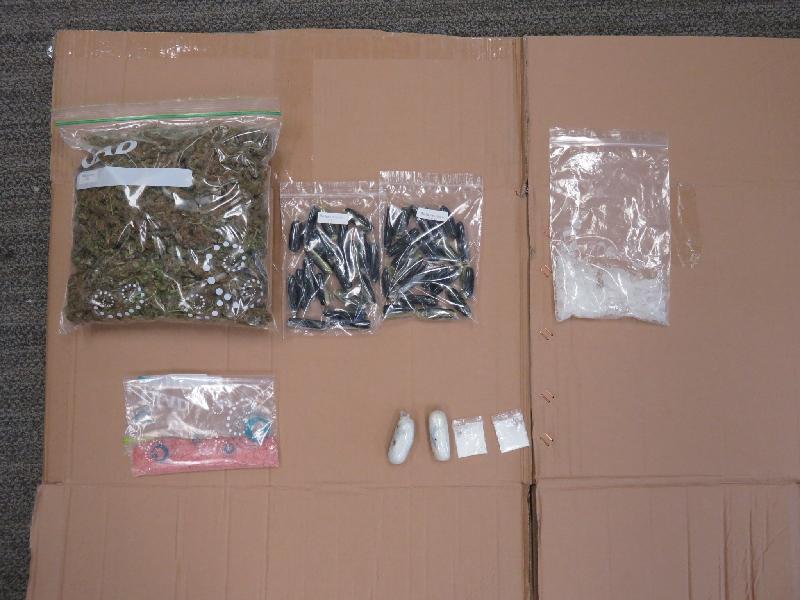 海關人員昨晚在尖沙咀截查一名男子,在其身上檢獲少量懷疑大麻花。海關人員其後再帶同該名男子往金馬倫道一個住宅單位搜查,發現更多懷疑毒品,共檢獲二千五百克懷疑大麻花、一千三百克懷疑大麻精、一百克懷疑冰毒、五十克懷疑可卡因及五十克懷疑搖頭丸粉末。