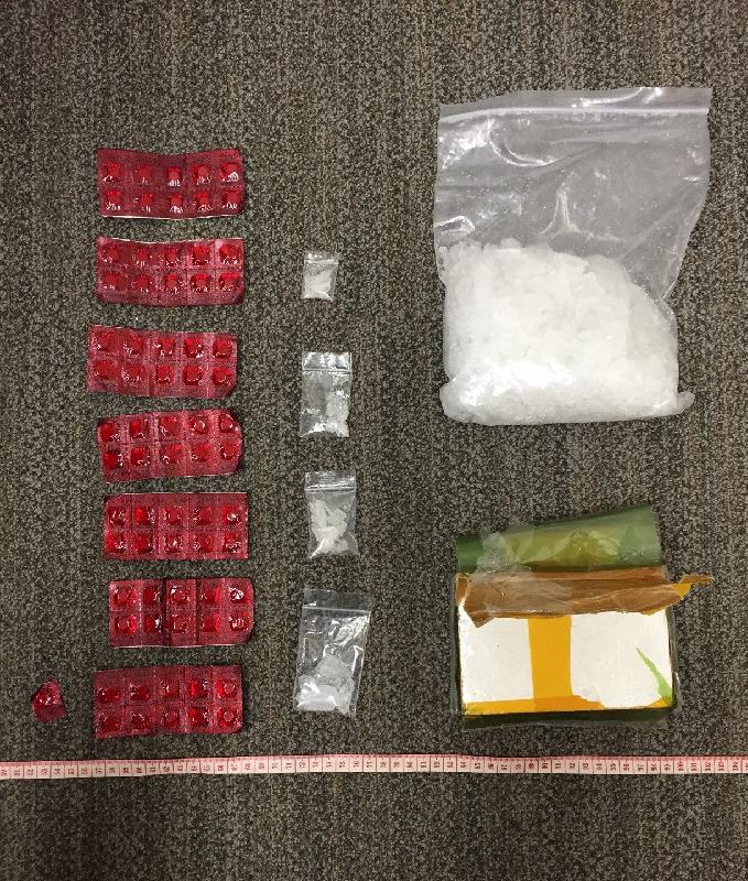 香港海關今日(九月三十日)在羅湖管制站拘捕一名男子,並檢獲五百一十八克懷疑冰毒、三百七十六克懷疑海洛英、七十一粒懷疑硝甲西泮、二百零二支未完稅香煙及一批懷疑用作吸食毒品的工具,市值共約四十六萬元。