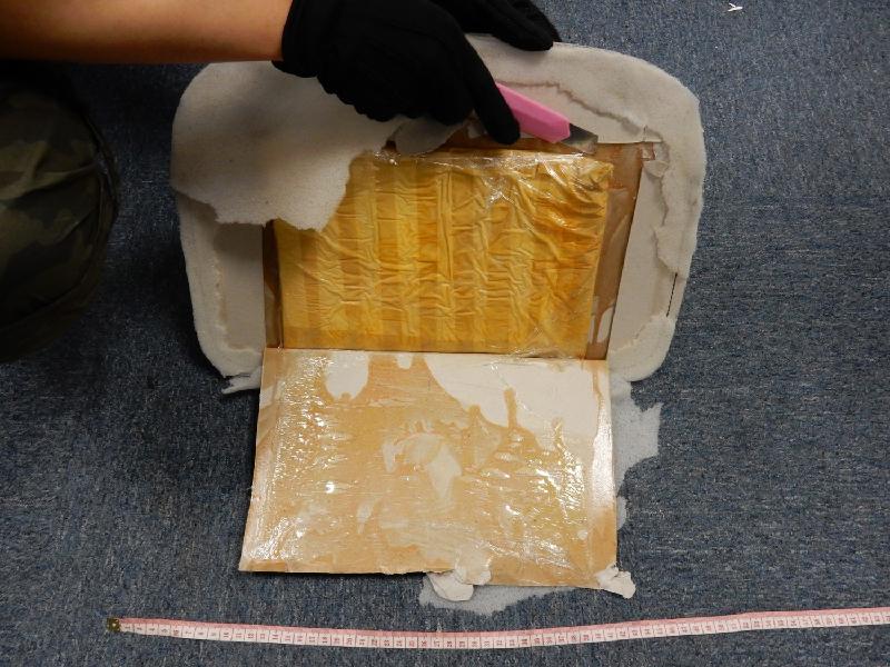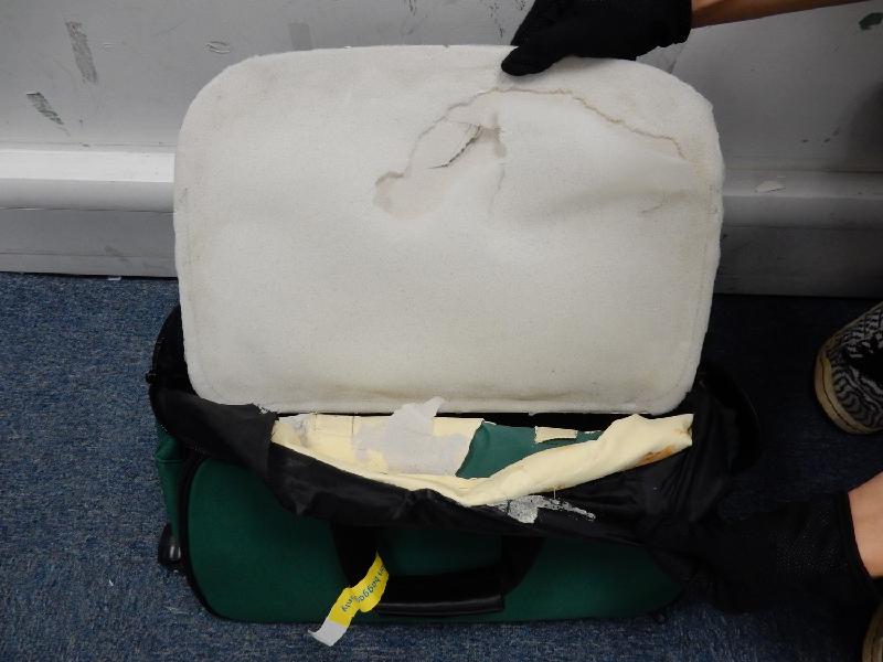 機場海關人員於九月二十五日為兩名從菲律賓馬尼拉飛抵本港的女子進行清關檢查。X光檢查顯示她們所攜帶的兩個手提行李箱有可疑影像,進一步檢查後發現兩個行李箱的暗格內共藏有四塊懷疑可卡因,相信販毒分子意圖藉此逃避海關人員的偵查。海關毒品調查科人員及後跟進調查,於今早(九月二十七日)在香港國際機場拘捕另外兩名正準備離港的涉案女子。