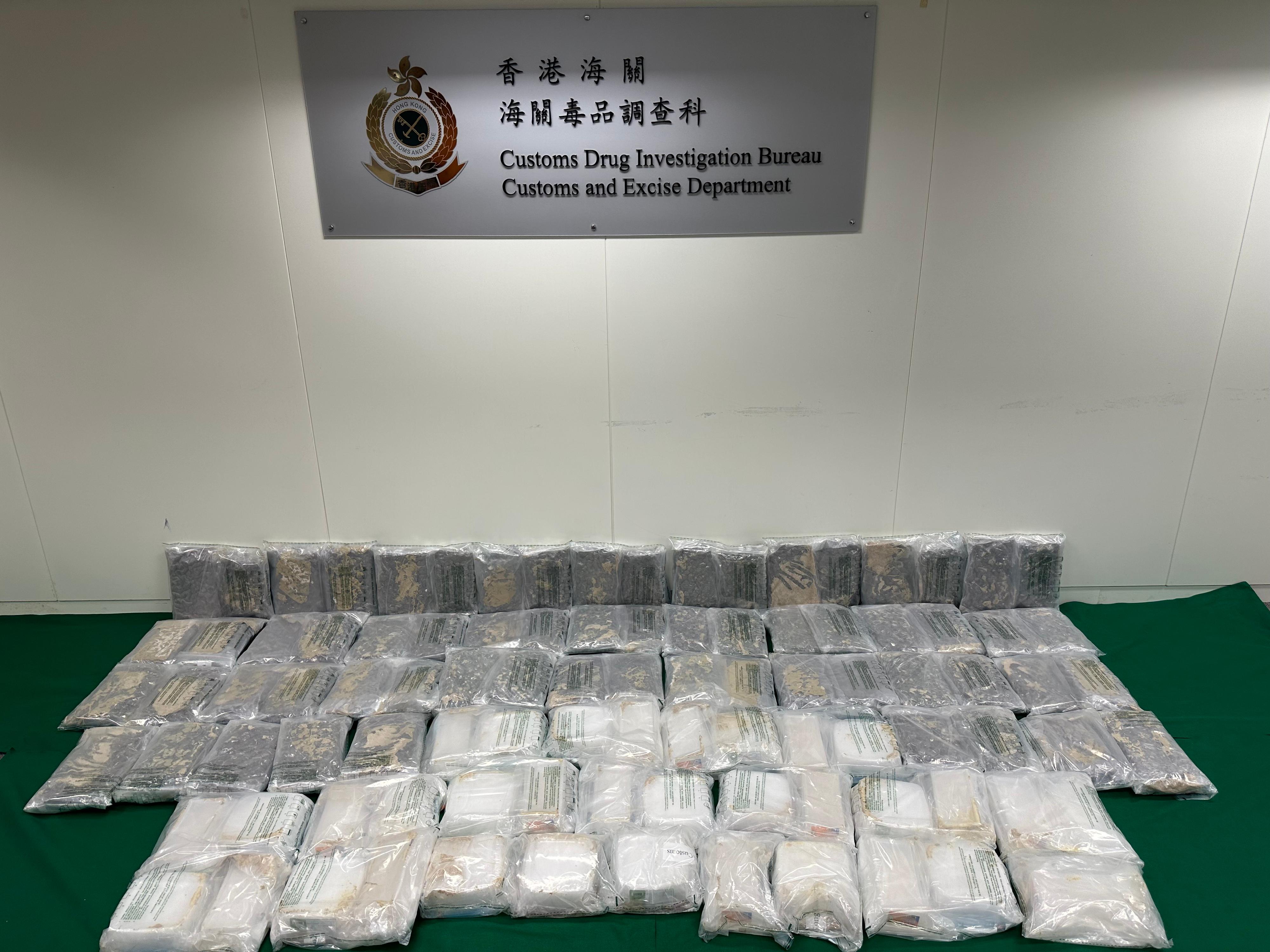 香港海關一月十四日在葵涌海關大樓驗貨場檢獲約三十四公斤懷疑冰毒和約三十八公斤懷疑大麻花,估計市值共約三千萬元。
